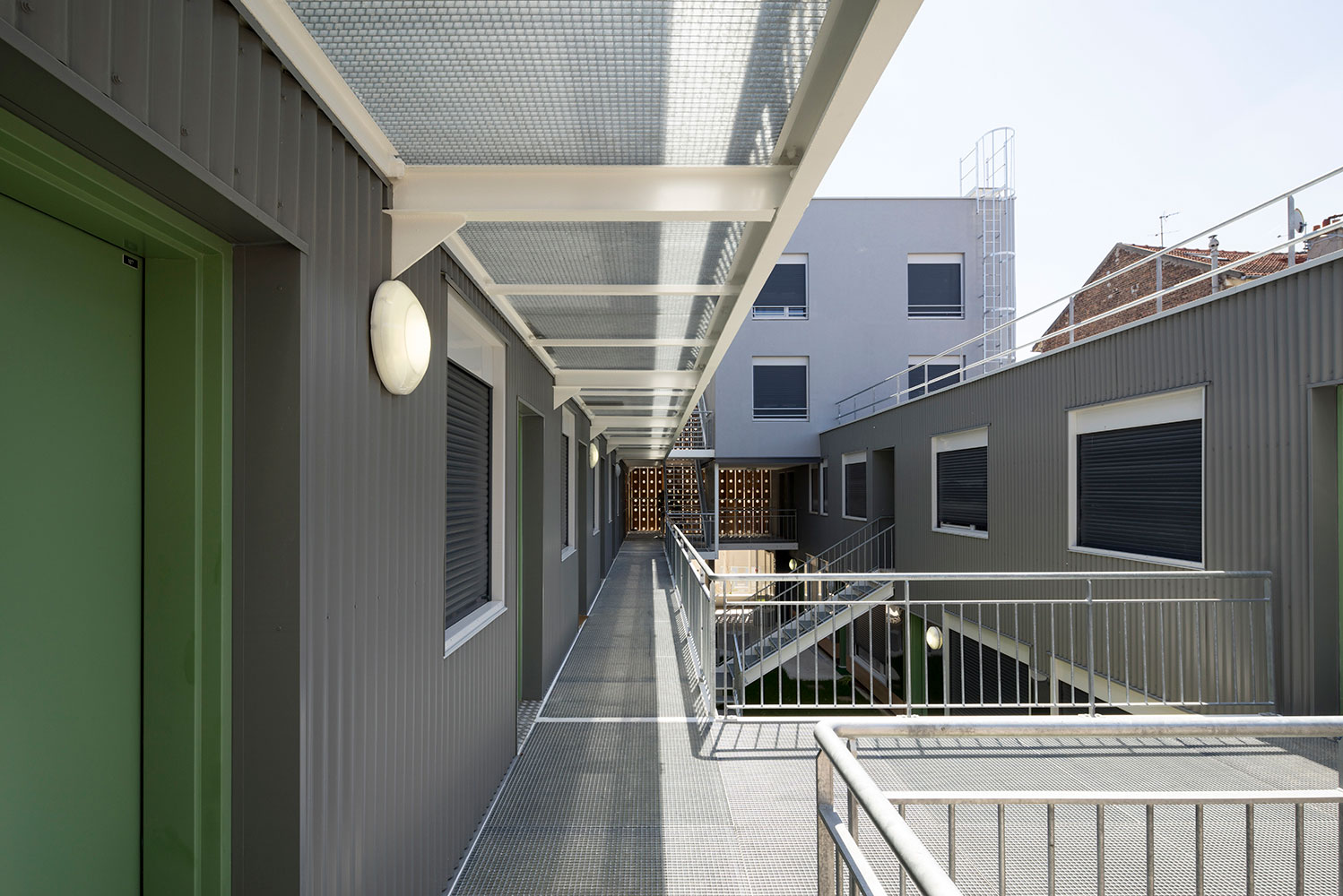 Les percements de baies, généralement carrées et de dimensions variées, individualisent les logements, tandis que l’utilisation du bois contribue à une conception chaleureuse de l’habitat social.
